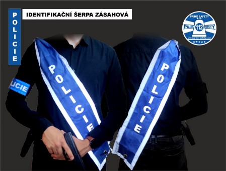 Identifikační šerpa zásahová je vyrobena z umělých vláken, opatřena bílými retroreflexními pruhy a retroreflexním, oboustraným, identifikačním nápisem POLICIE. Může být dodána s opaskovým pouzdrem s upevněním na opasek.